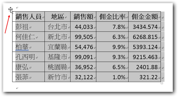 2. 在Word表格左上角那個正方形上方,按滑鼠左鍵一下,選取整個表格,如下圖所示。
