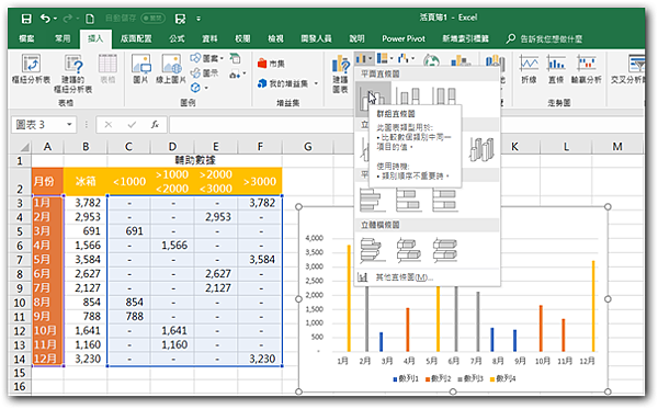 步驟8:點取「插入 > 圖表 > 插入直條圖或橫條圖」倒三角鈕,再選擇「群組直條圖」圖示,如下圖所示。