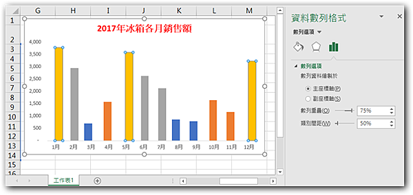 步驟12:在【資料數列格式】對話方塊,點取「數列重疊」欄位,輸入「75%」。