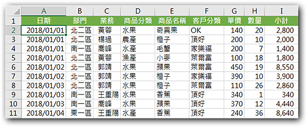 案例:台灣貿易股份有限公司2018年銷售記錄表,如下圖所示。