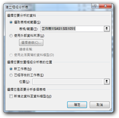 3.在【建立樞紐分析表】對話方塊,點取「表格/範圍」欄位,輸入「$A$1:$I$1051」字串,用框選範圍會出現工作表名稱,由於是在目前工作表作業,所以有無工作表名稱無影響。