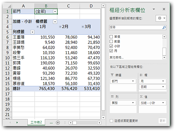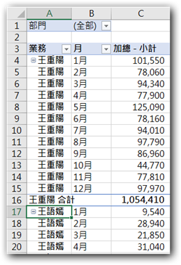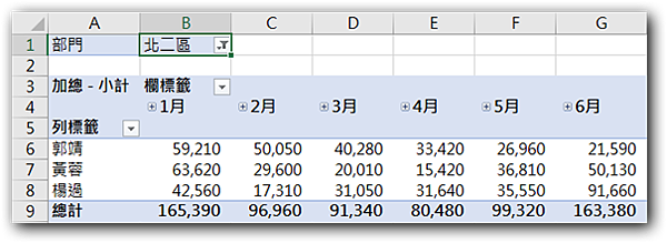 若我們欲顯示各個部門的業務員銷售金額,則可以點取B1儲存格倒三角鈕,選擇欲顯示的部門(本例為:北二區)。