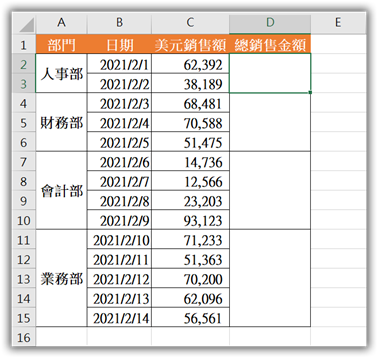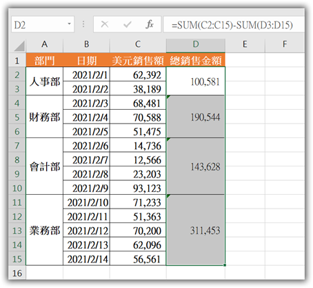 SUM(C2:C15)- SUM(D3:D15) 計算C2:C15儲存格(所有部門)的總和減去D3:D15(其他三個部門)儲存格的總銷售金額,這是由於D2要統計的是第一個部門(人事部)總銷售金額。