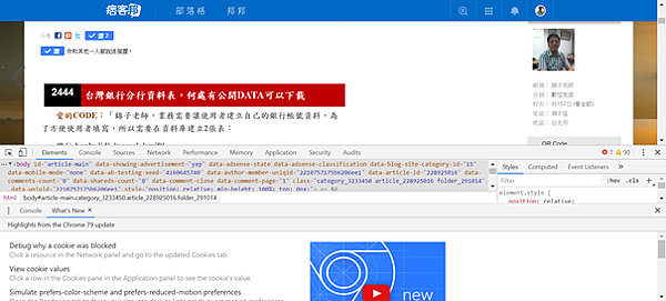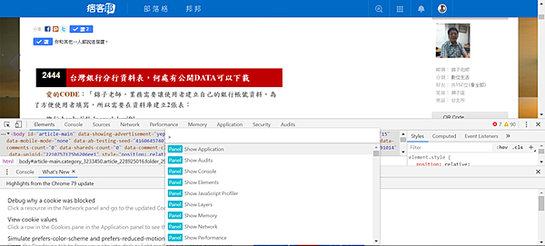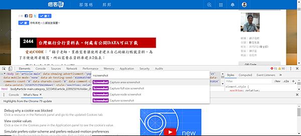 開啟Google Chrome瀏覽器後,在要截圖的網頁按下CREL+SHIFT+I鍵,這時在右邊或下邊會跳出開發者工具。