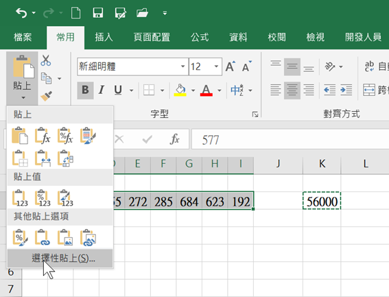 步驟3:點取「常用 > 貼上▼鈕 > 選擇性貼上」指令。