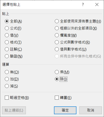 步驟4:在【選擇性貼上】對話方塊,點取「除」選項鈕。