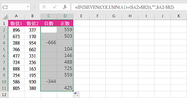 嚴紹文:錦子老師您好,如下圖,我在日A、B二欄各有數值,我想要將A欄減B欄的數值後,將負數自動填入C欄,正數填入D欄?不知是否能指導一下。