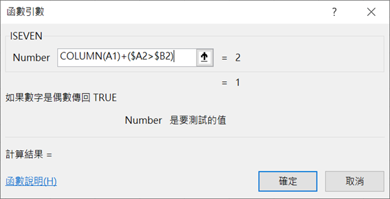 公式1運算結果加上(A2儲存格數值是否大於B2儲存格數值,是則傳回TRUE(1),否則傳回FALSE(0))是否為偶數,是則傳回TRUE(1),否則傳回FALSE(0)。