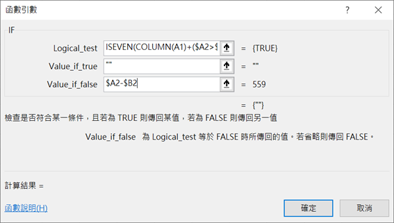 如果公式2運算結果為TRUE,則不填入資料,如果公式2運算結果為FALSE。則將A2儲存格數值減掉B2儲存格數值。