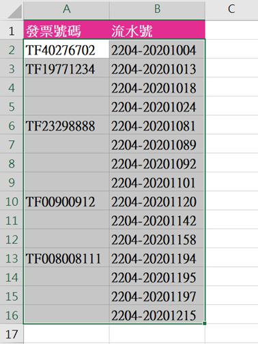 影鳯:錦子老師您好,請問如果將左手邊空白的儲存格可以都比照上一筆發票號碼填入呢?由於資料量太大了,若手動輸入複製,耗費遽時。