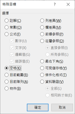 步驟3:在【特殊目標】對話方塊,點取「空格」選項鈕,使其變黑。