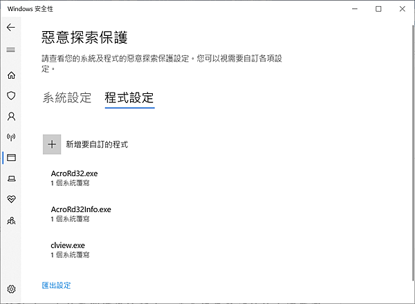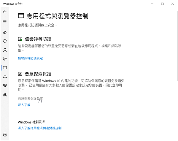 在【應用程式與瀏覽器控制】頁面,點取「惡意探索保護設定」項目。
