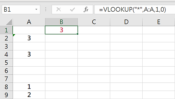 在B1儲存格輸入公式:「=VLOOKUP("*",A:A,1,0)」。