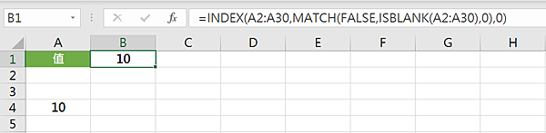 在B1儲存格輸入公式:「=INDEX(A2:A30,MATCH(FALSE,ISBLANK(A2:A30),0),0)」。