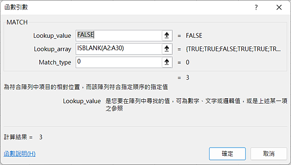 公式二:MATCH(FALSE,公式一,0),0) 利用MATCH函數傳回A2:A30中第一個FALSE所在儲存格是範圍中第幾列。
