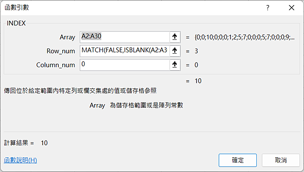 公式三:INDEX(A2:A30,公式二,0) 傳回A2:A30範圍中第幾列(公式二運算結果)內容,欄不變動。