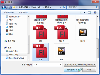 步驟2: 選取練習檔「S03.FLA」,再點取「開啟舊檔」鈕,如下圖所示。