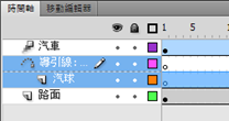 步驟8: 在「汽球」圖層文字上方,按下滑鼠右鍵,選擇「增加移動導引線」項目,新增的圖層會自動命名為「導引線:汽球」,表示此圖層為汽球圖層的導引圖層,如下圖所示。
