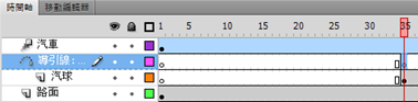 步驟11: 現在要讓導引線與氣球作關聯,點取「汽球」圖層影格35,再點取「工具箱」中「選取工具 」,將舞台中的氣球拖曳到導引線上,如下圖所示。