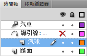 由於實際播放時,導引線是不會顯示在動畫中,為了預覽實際的動畫內容,我們可以點取「導引線:汽球」圖層的眼晴欄的圓點,將其變為「û」狀,如下圖所示,將導引線隱藏起來。