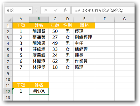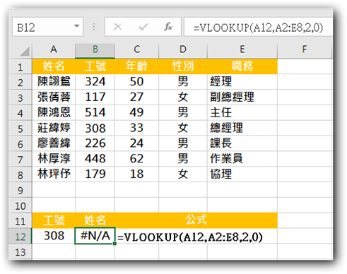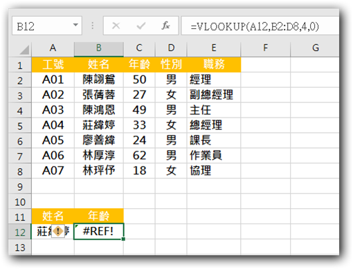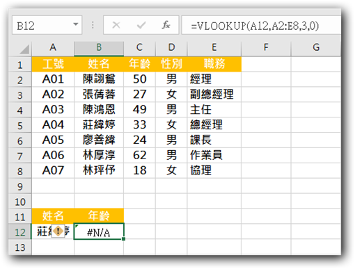 如下圖所示,根據姓名查找年齡時產生錯誤。