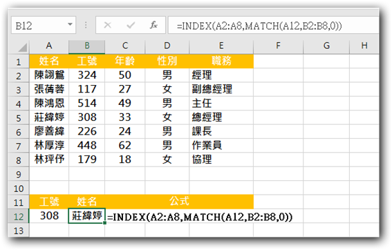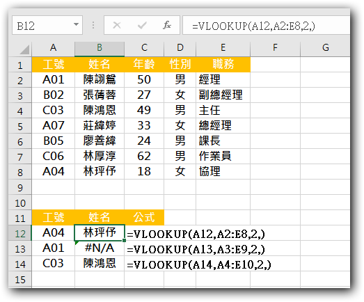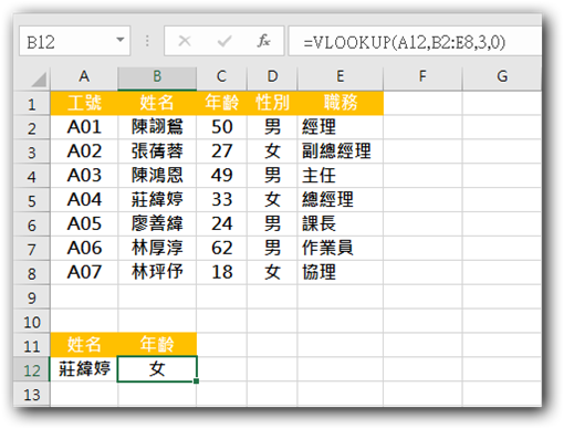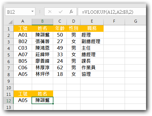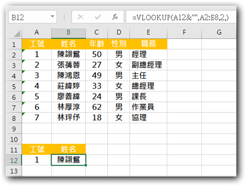 B12公式改為:=VLOOKUP(A12,A2:E8,2,0)