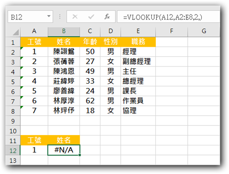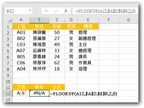 如下圖所示,根據姓名查找職務時產生查找錯誤。