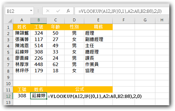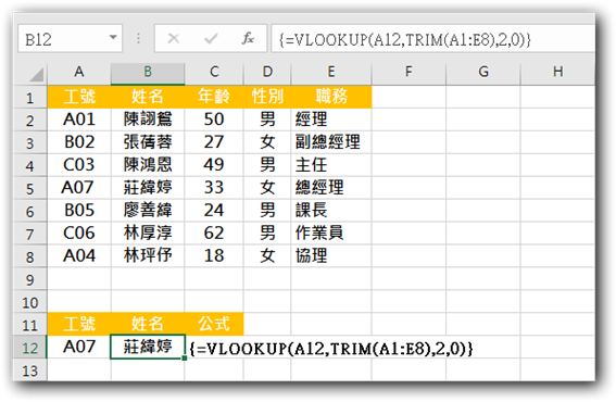 即:輸入公式:「=VLOOKUP(A12,TRIM(A1:E8),2,0)」後,按Ctrl + Shift + Enter鍵,輸入後陣列形式為 {=VLOOKUP(A12,TRIM(A1:E8),2,0)}