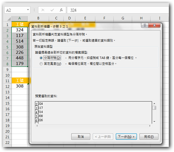 解決方案:在A欄後插入幾欄空欄,然後對A欄進行分欄操作(資料 >資料工具 > 資料剖析),即可把不可見字元分離出去。