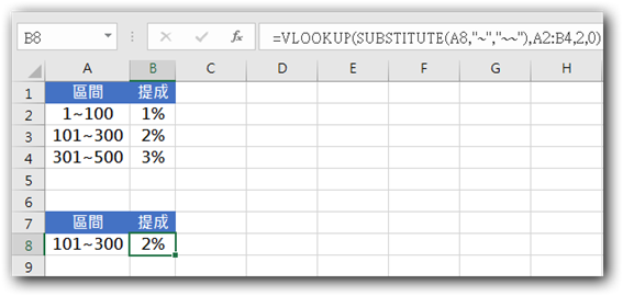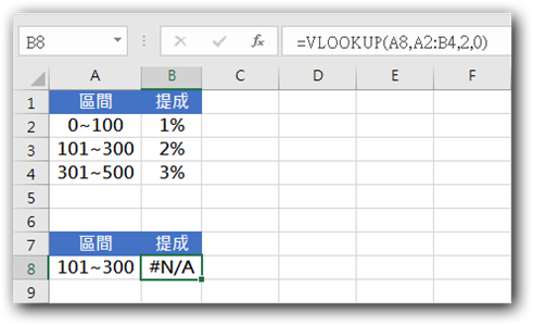 如下圖所示,根據範圍查找提成傳回錯誤值。