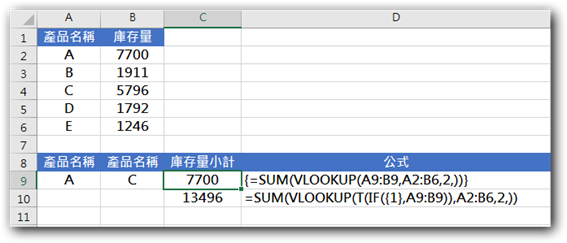 如下圖所示,同時查找A和C產品的和,然後用SUM求總和。