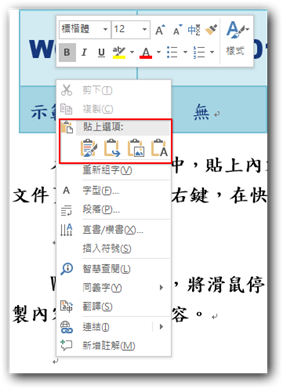 在Word 2016中,貼上內容時,具有四種格式,並支援貼上內容預覽。在複製內容後,在Word 2016文件頁面,按滑鼠右鍵,在快顯功能表中選擇需要的貼上選項,如下圖所示。