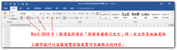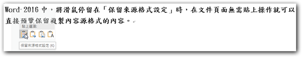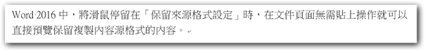 Word 2016中,按滑鼠右鍵一下,點取「合併格式設定」時,也可以輕鬆預覽該格式的貼上內容,若目的所在段落並無任何不同格式設定,則與「保留來源格式設定」是一樣結果。