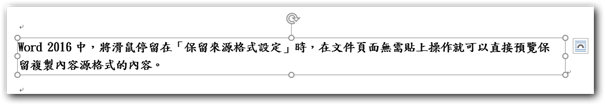 Word 2016中,按滑鼠右鍵一下,點取「保留來源格式設定」圖示時,在文件頁面無需貼上操作就可以直接預覽保留複製內容源格式的內容。