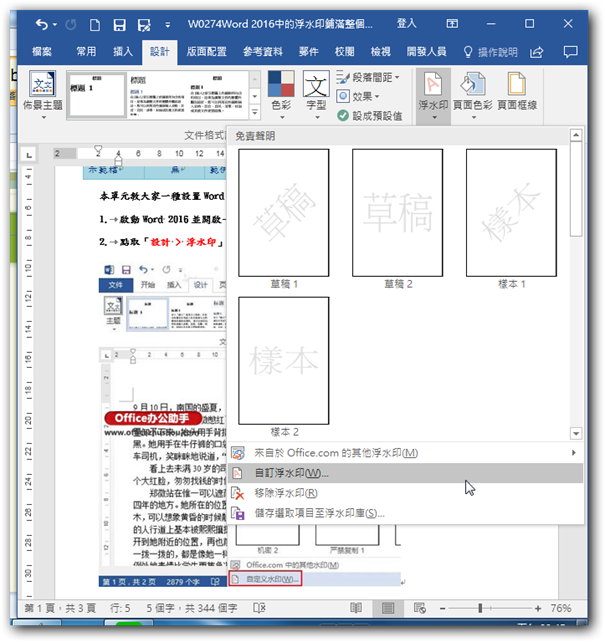 2. 點取「設計 > 浮水印」下拉方塊,從彈出的功能表中點取「自訂浮水印」選項,如下圖所示,開啟「列印浮水印」對話方塊。