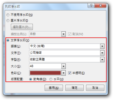 9. 點取「版面配置」群組中「對角線」選項鈕,使其變深紅色,如下圖所示,這樣浮水印顏色淺,不至於覆蓋文字內容,影響閱讀。