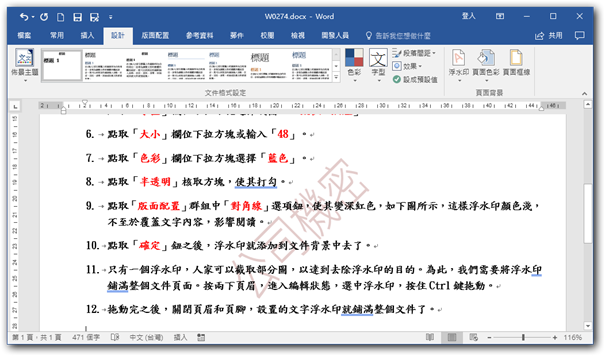 10. 點取「確定」鈕之後,浮水印就添加到文件背景中去了。