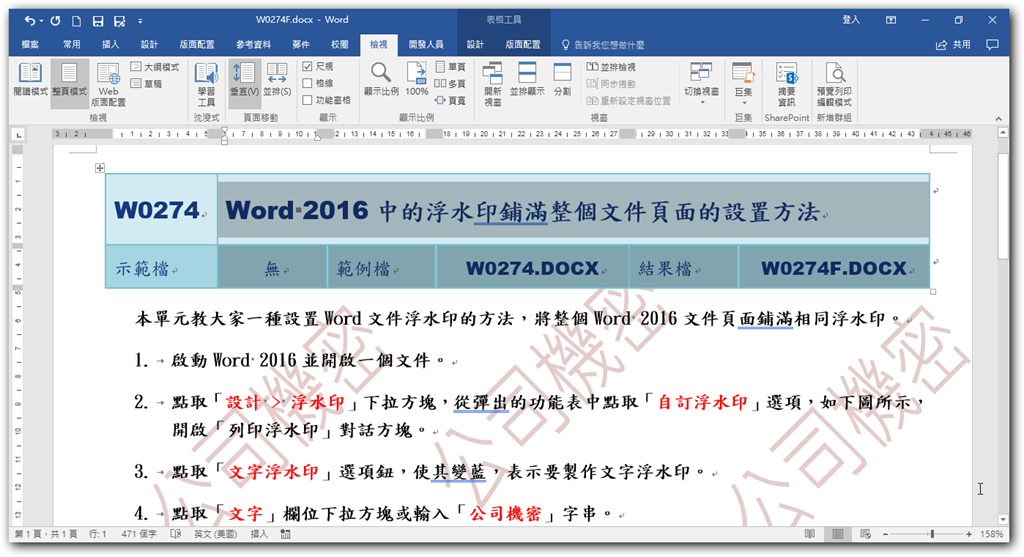 本單元教大家一種設置Word文件浮水印的方法,將整個Word 2016文件頁面鋪滿相同浮水印。